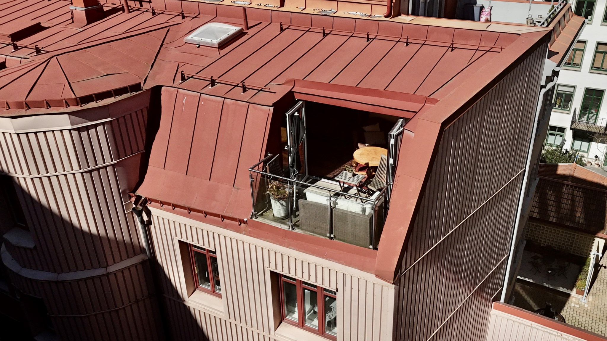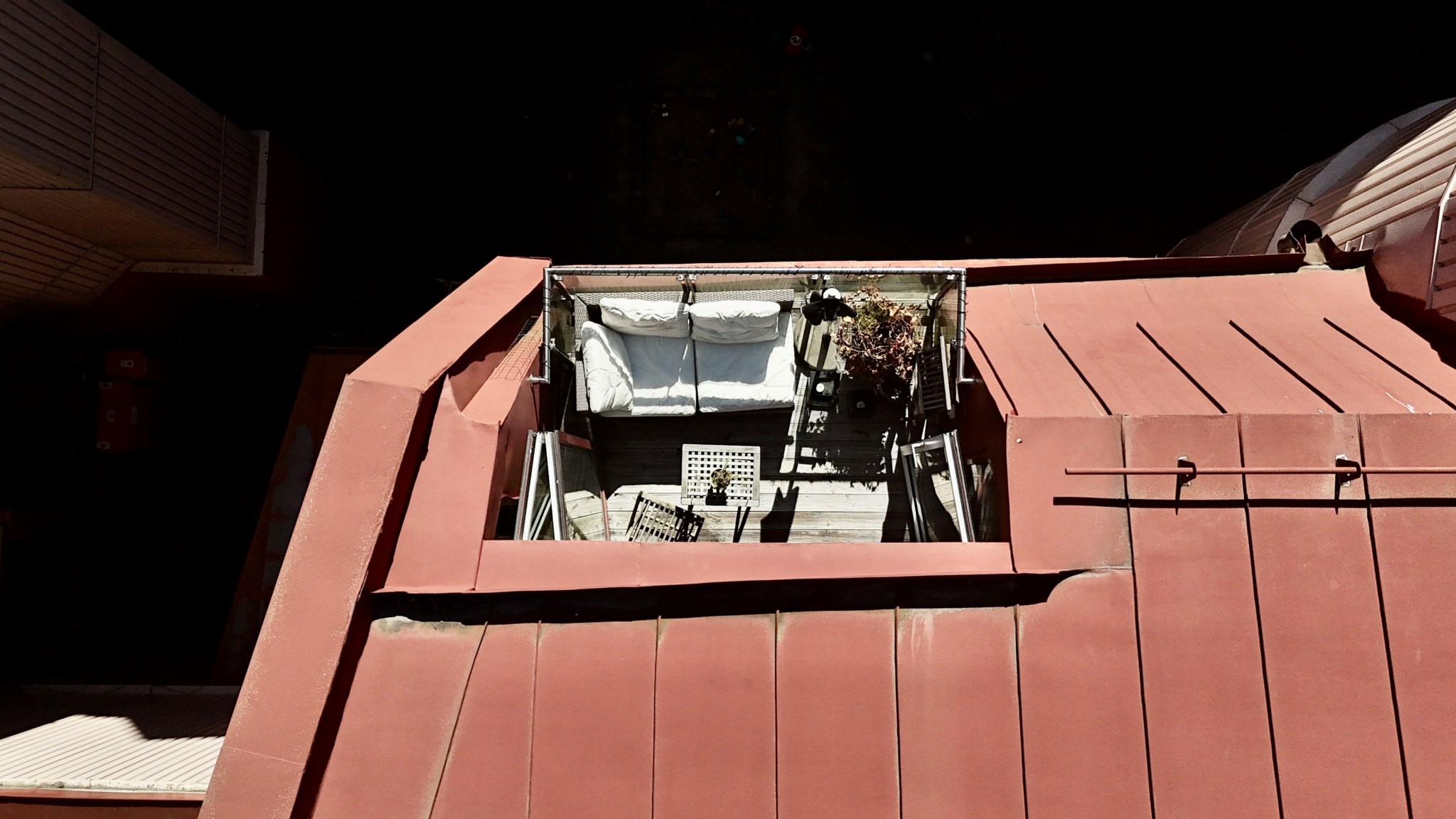 Denna lägenhet ligger på husets högsta våning och erbjuder en boendemiljö som sträcker sig över två etage. I bostaden har man tagit fram flertalet originaldetaljer, inklusive en tegelvägg och synliga takstolar. Lägenheten har tillgång till en terrassen som ligger högt upp.