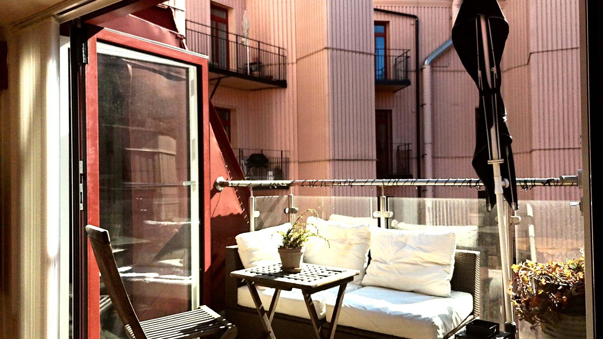 Terrass på översta plan i söderläge. Solen når terrassen ungefär mellan 12.00 och 19.00 på sommaren.