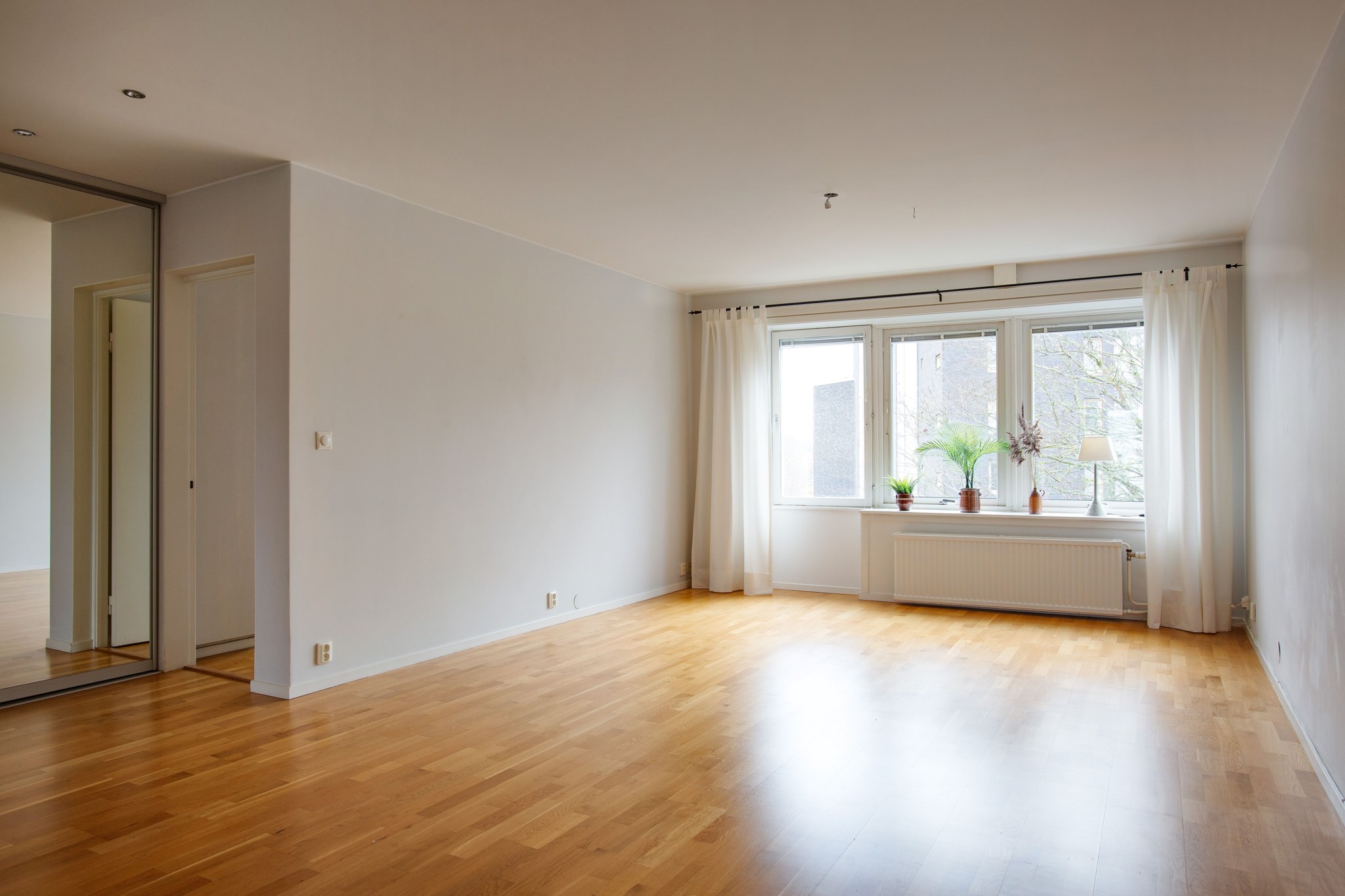 Parkettgolv och målade väggar. Plats för stor soffgrupp och TV-möbel. Eftersom ytan är stor ryms även en stor matsalsmöbel med stolar.