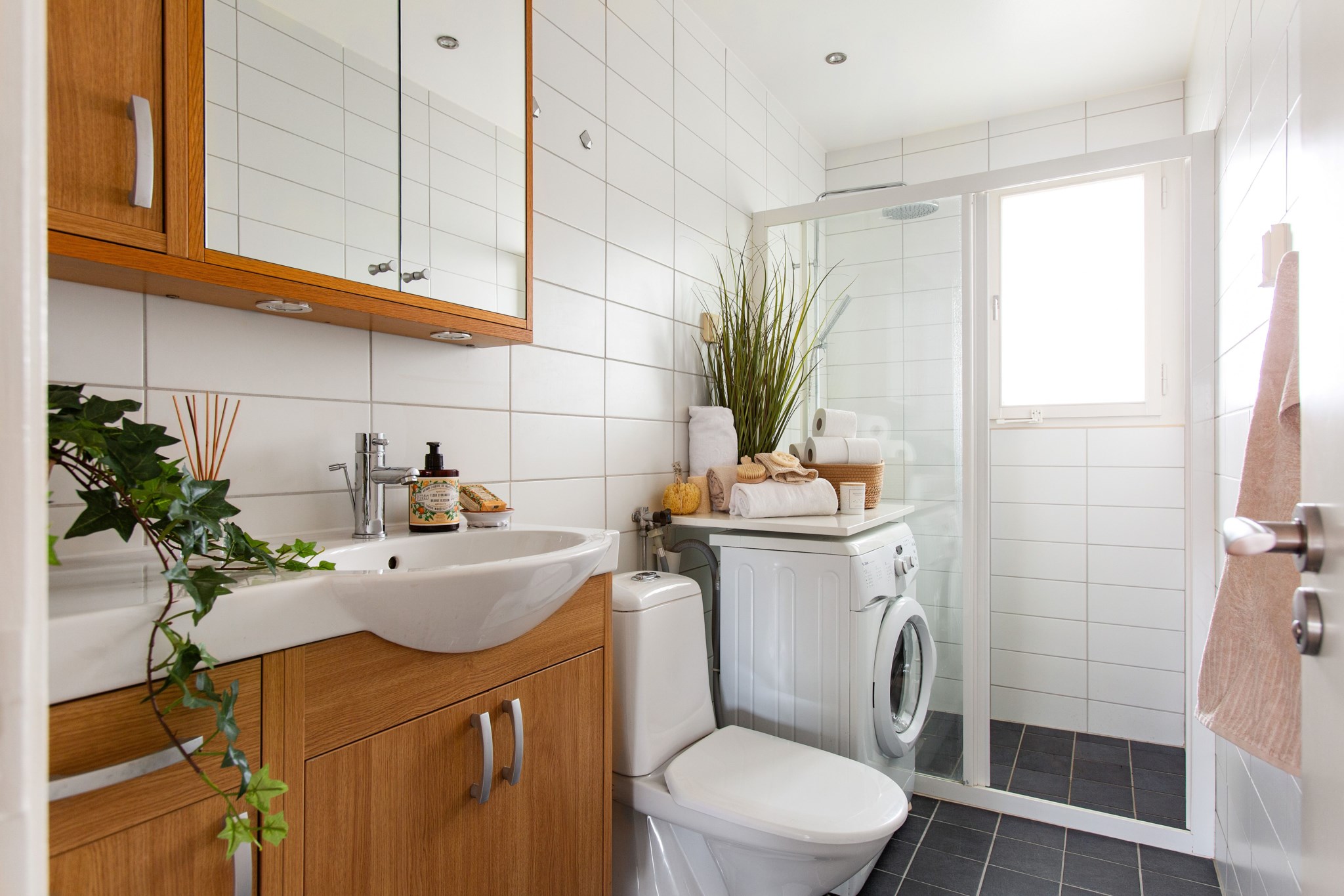 Grått klinkergolv med golvvärme och helkaklade väggar i vitt. Badrummet är utrustat med WC, handfat med kommod, spegelskåp, tvättmaskin samt dusch med glasväggar.